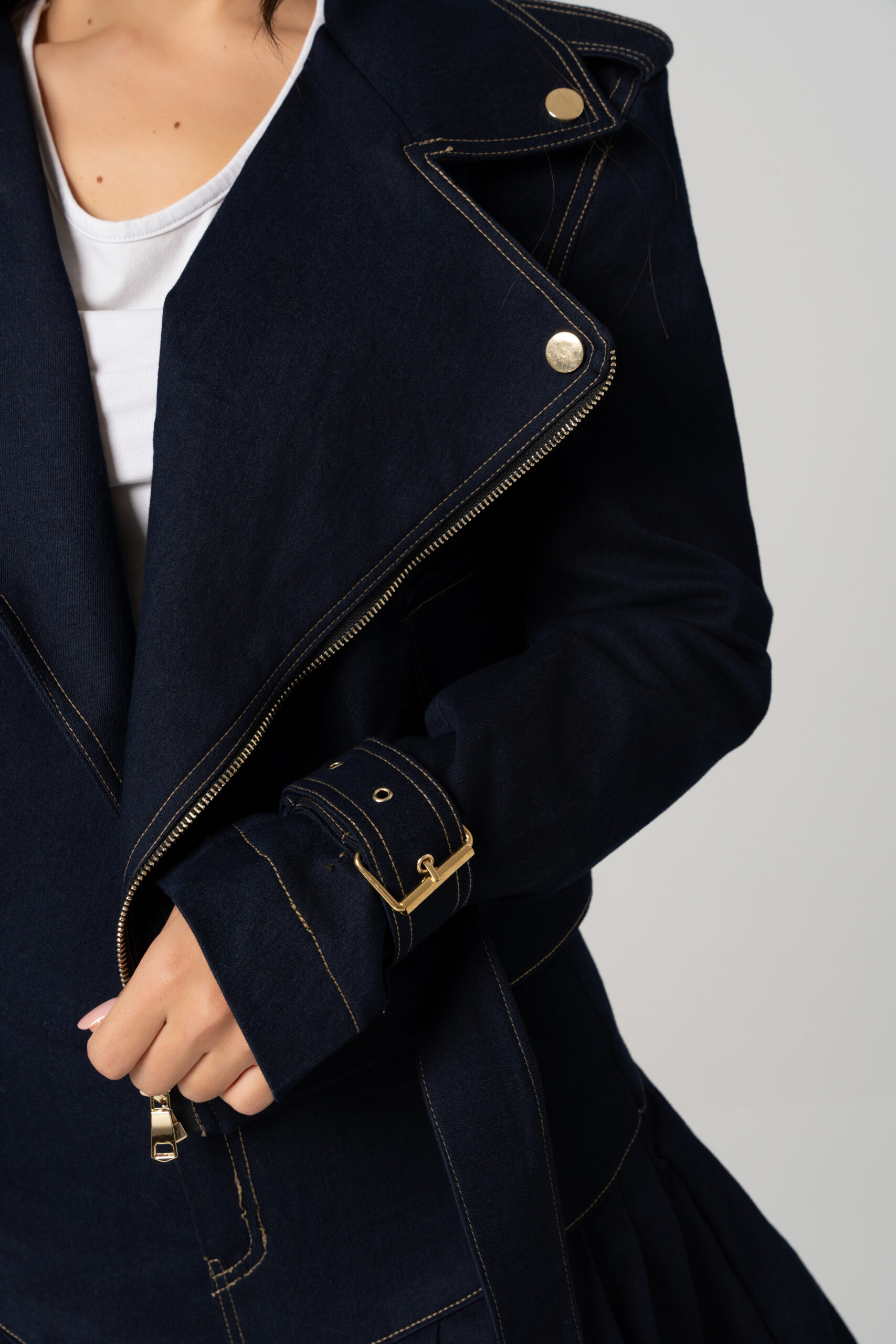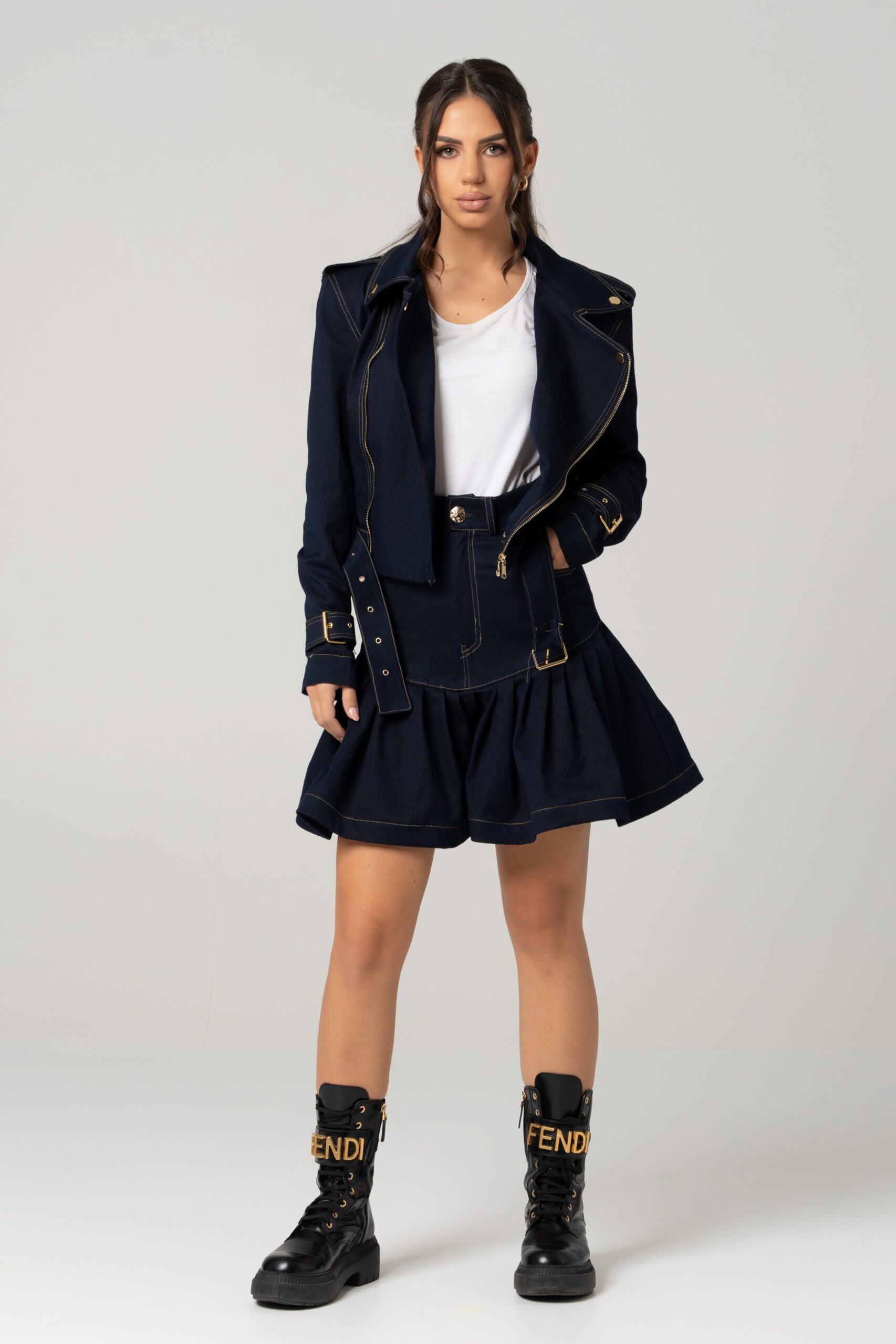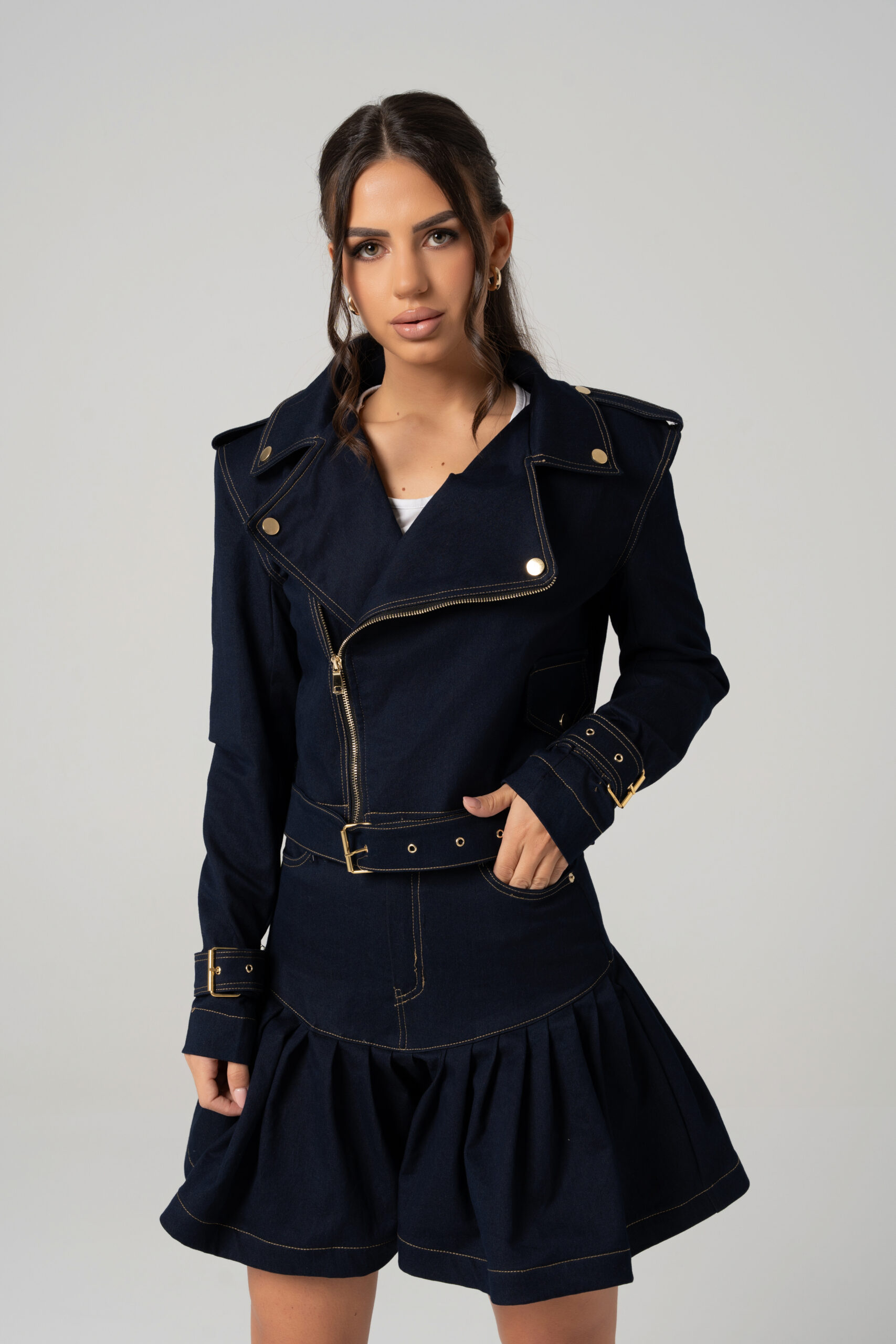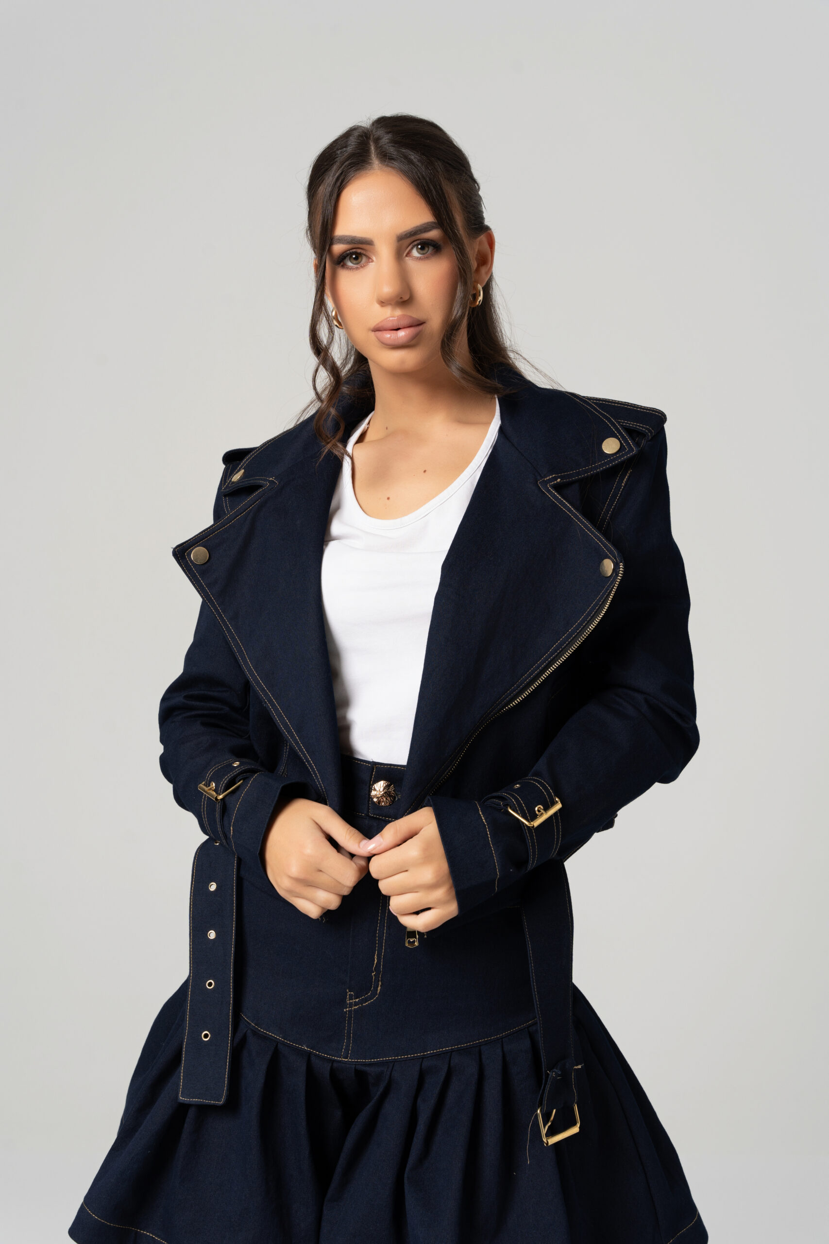 Teksas bajker jakna sa zlatnim detaljima i kaišem pruža modernu i urbanu estetiku. Savršena za slojevite kombinacije, može se nositi uz farmerke, suknje ili haljine, dodajući karakter svakoj kombinaciji.